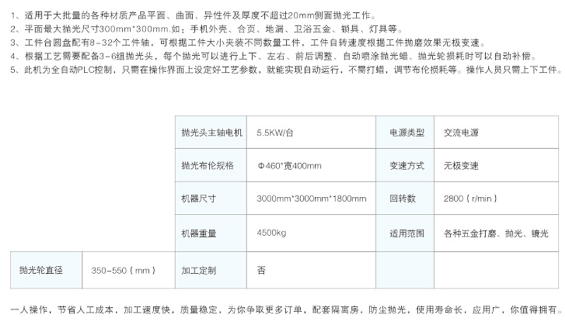 所属分类: 自动抛光机 温州耐洁机电科技有限公司提供的NJ-618-1圆盘抛光机适用于水暖器材、灯饰产品、洁具卫浴、餐具厨具、机箱机柜、家具、模具、锁具、压铸行业、汽车行业、运动器材、医疗器材、亚克力塑胶饰品、五金电子等行业。